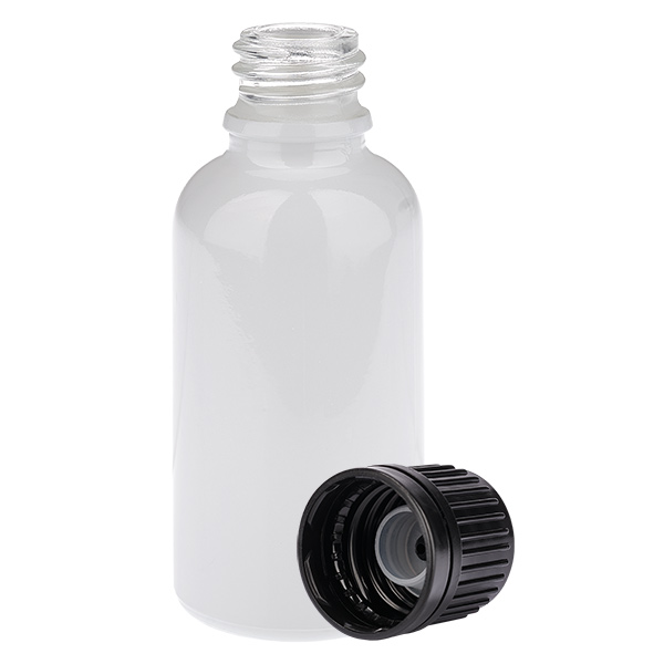 - Descrizione del flacone in vetro: tipo di vetro III (DIN 719 o classe di contenitori III secondo DIN 52339-TO180). Il vetro trasparente viene rivestito con un complesso procedimento che conferisce alla superficie esterna un colore bianco brillante. Ciò garantisce una presentazione di alta qualità del contenuto. È possibile vedere il livello di riempimento del vetro. Il contenuto è comunque protetto dalla luce solare diretta.