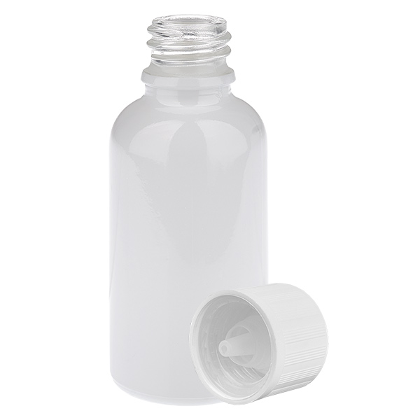 - Descrizione del flacone in vetro: tipo di vetro III (DIN 719 o classe di contenitori III secondo DIN 52339-TO180). Il vetro trasparente viene rivestito con un bianco brillante all'esterno mediante un processo complesso. Ciò garantisce una presentazione di alta qualità del contenuto. È possibile vedere il livello di riempimento del vetro. Il contenuto è comunque protetto dalla luce solare diretta.