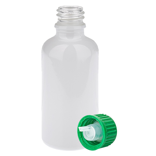 - Descrizione del flacone in vetro: tipo di vetro III (DIN 719 o classe di contenitori III secondo DIN 52339-TO180). Il vetro trasparente viene rivestito con un complesso procedimento che conferisce alla superficie esterna un colore bianco brillante. Ciò garantisce una presentazione di alta qualità del contenuto. È possibile vedere il livello di riempimento del vetro. Il contenuto è comunque protetto dalla luce solare diretta.