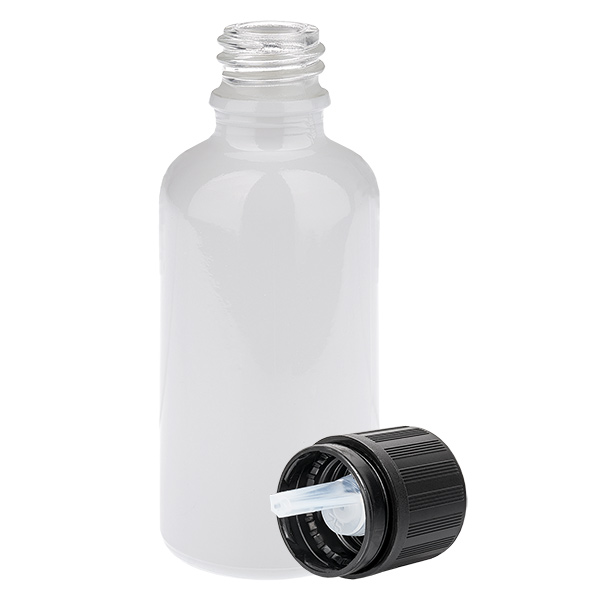 - Descrizione del flacone in vetro: tipo di vetro III (DIN 719 o classe di contenitori III secondo DIN 52339-TO180). Il vetro trasparente viene rivestito con un bianco brillante all'esterno mediante un processo complesso. Ciò garantisce una presentazione di alta qualità del contenuto. È possibile vedere il livello di riempimento del vetro. Il contenuto è comunque protetto dalla luce solare diretta.
