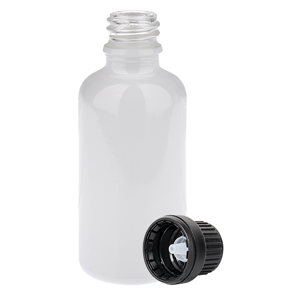 - Descrizione del flacone in vetro: tipo di vetro III (DIN 719 o classe di contenitori III secondo DIN 52339-TO180). Il vetro trasparente viene rivestito con un bianco brillante all'esterno mediante un processo complesso. Ciò garantisce una presentazione di alta qualità del contenuto. È possibile vedere il livello di riempimento del vetro. Il contenuto è comunque protetto dalla luce solare diretta.