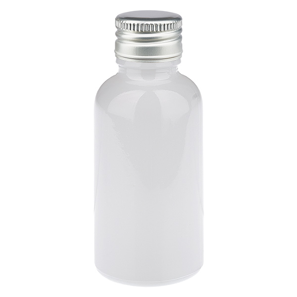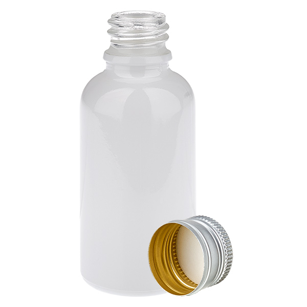 - Descrizione del flacone in vetro: tipo di vetro III (DIN 719 o classe di contenitori III secondo DIN 52339-TO180). Il vetro trasparente viene rivestito con un complesso procedimento che conferisce alla superficie esterna un colore bianco brillante. Ciò garantisce una presentazione di alta qualità del contenuto. È possibile vedere il livello di riempimento del vetro. Il contenuto è comunque protetto dalla luce solare diretta.