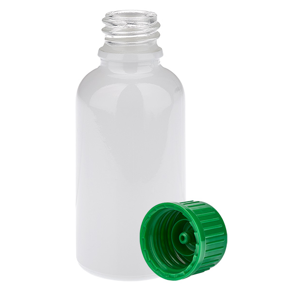 - Descrizione del flacone in vetro: tipo di vetro III (DIN 719 o classe di contenitori III secondo DIN 52339-TO180). Il vetro trasparente viene rivestito con un complesso procedimento che conferisce alla superficie esterna un colore bianco brillante. Ciò garantisce una presentazione di alta qualità del contenuto. È possibile vedere il livello di riempimento del vetro. Il contenuto è comunque protetto dalla luce solare diretta.