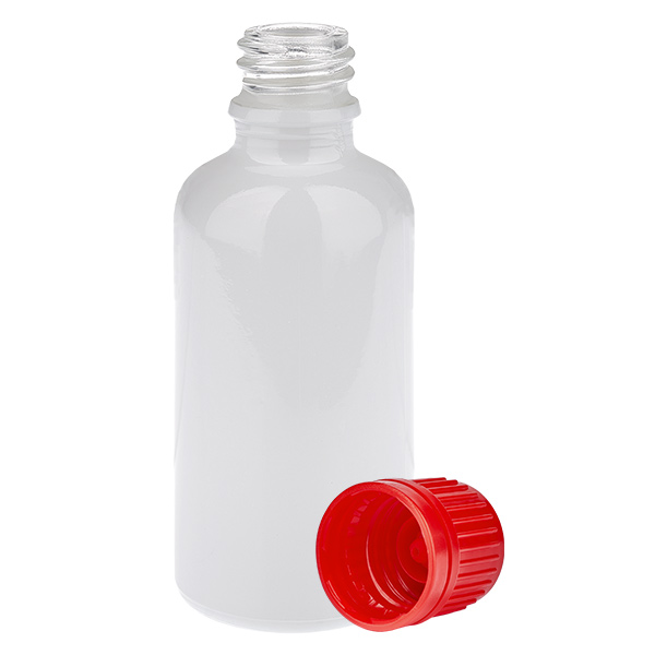 - Descrizione del flacone in vetro: tipo di vetro III (DIN 719 o classe di contenitori III secondo DIN 52339-TO180). Il vetro trasparente viene rivestito con un bianco brillante all'esterno mediante un processo complesso. Ciò garantisce una presentazione di alta qualità del contenuto. È possibile vedere il livello di riempimento del vetro. Il contenuto è comunque protetto dalla luce solare diretta.
