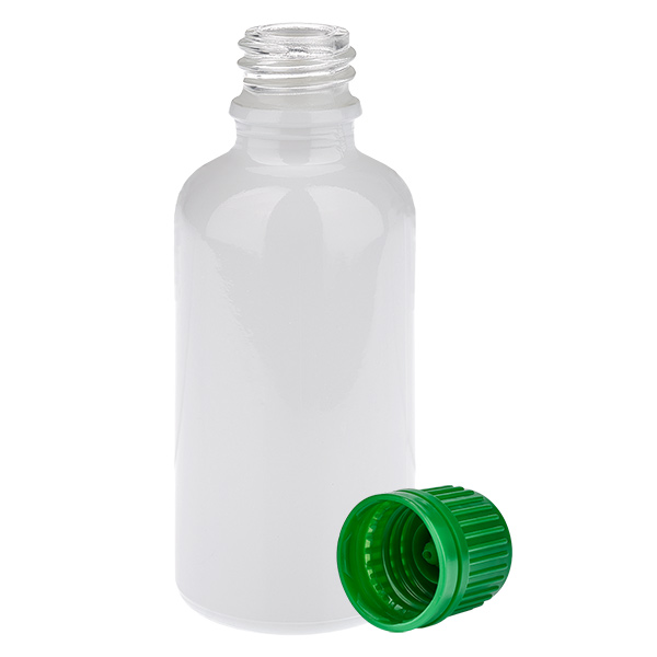 - Descrizione del flacone in vetro: tipo di vetro III (DIN 719 o classe di contenitori III secondo DIN 52339-TO180). Il vetro trasparente viene rivestito con un bianco brillante all'esterno mediante un processo complesso. Ciò garantisce una presentazione di alta qualità del contenuto. È possibile vedere il livello di riempimento del vetro. Il contenuto è comunque protetto dalla luce solare diretta.