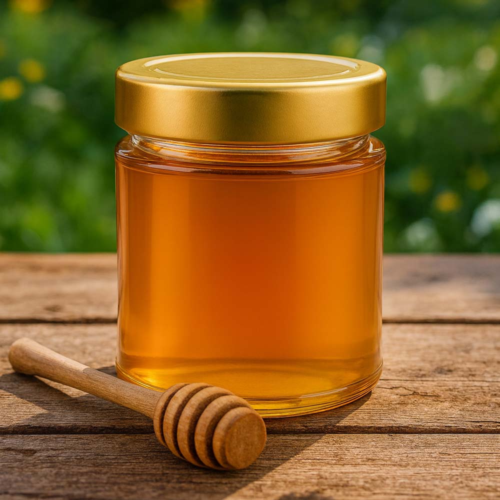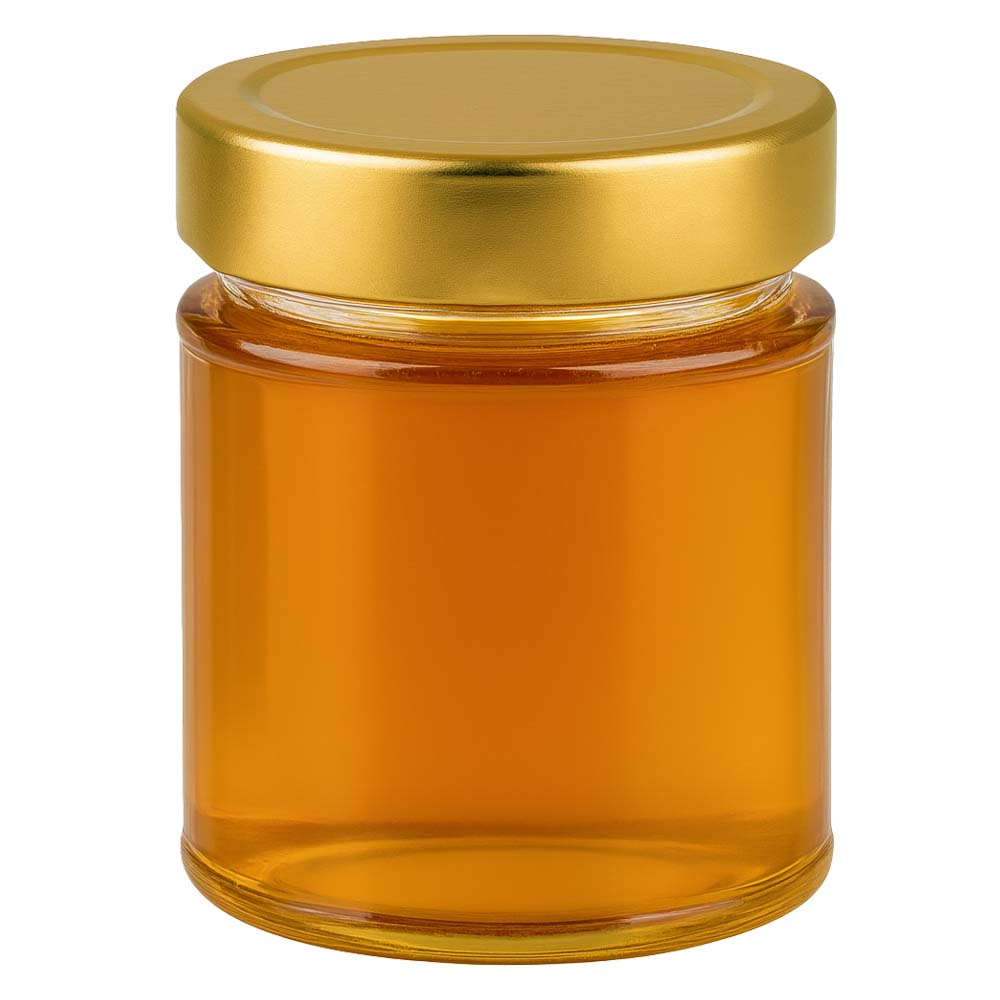Vasetto in vetro per miele da 200 g con elegante capsula dorata BasicSeal UNiTWIST. Perfetto per la vendita del miele, set regalo e presentazioni premium.