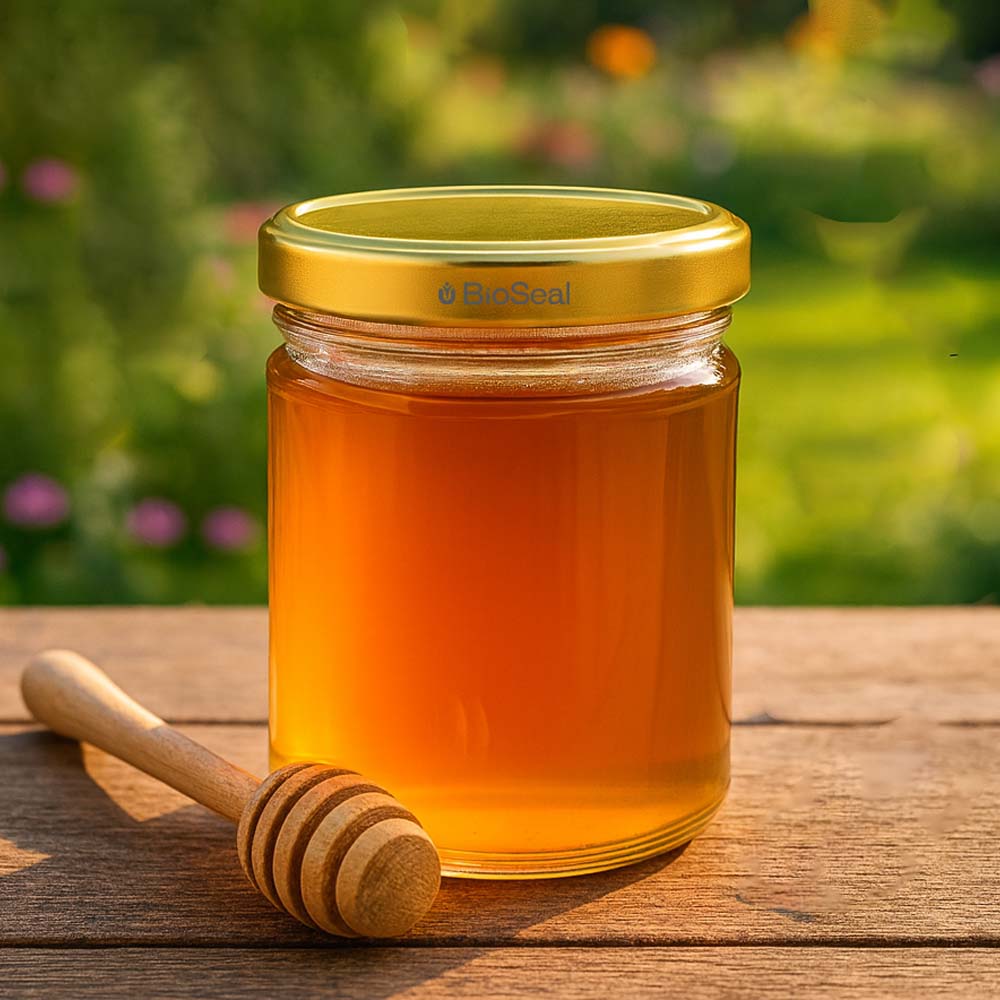 Vasetto per miele da 200 g con capsula dorata BioSeal UNiTWIST