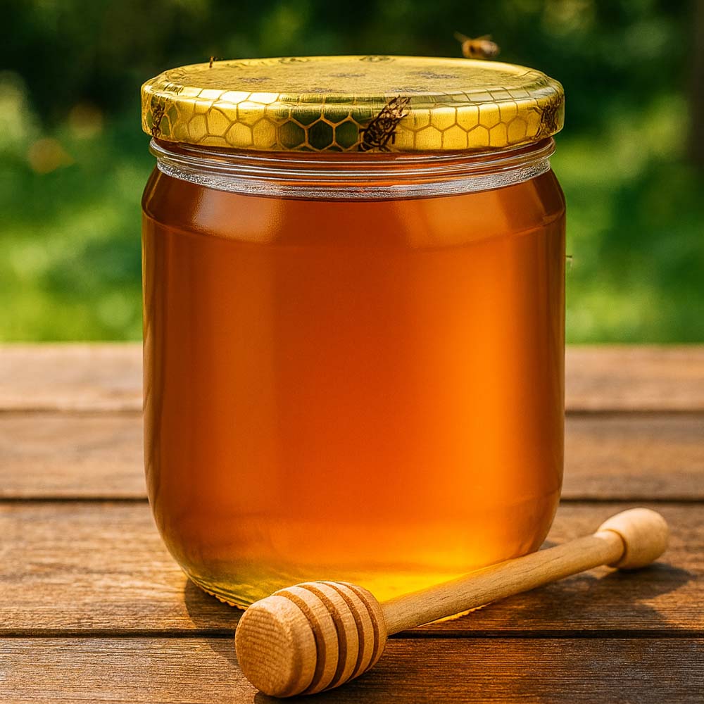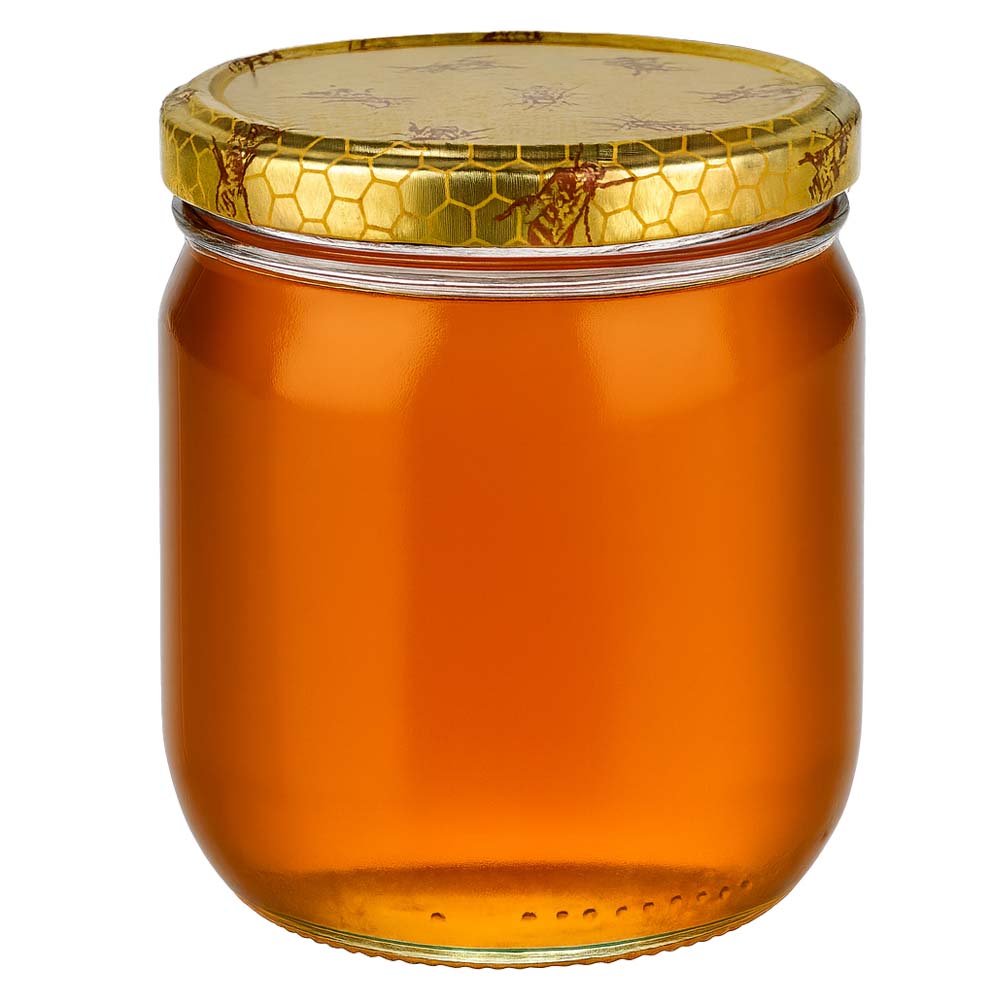 Vasetto in vetro per miele da 500 g con capsula metallica decorata con motivo a favo BasicSeal UNiTWIST. Il design a nido d’ape valorizza l’origine naturale del miele, ideale per confezioni regalo e presentazioni di qualità.