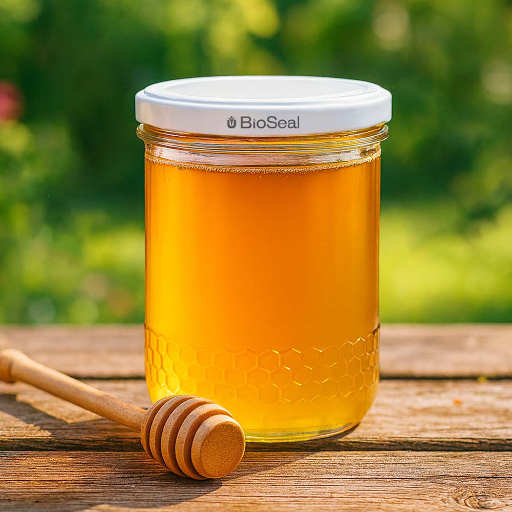 Vasetto in vetro per miele da 560 g con capsula metallica bianca BioSeal UNiTWIST. Una soluzione perfetta per confezioni familiari, presentazioni moderne e vendita premium.