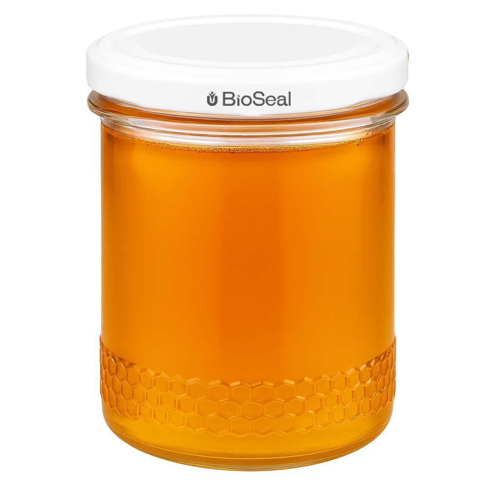 Vasetto in vetro per miele da 560 g con capsula metallica bianca BioSeal UNiTWIST. Una soluzione...di più